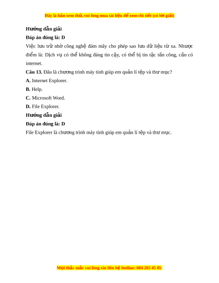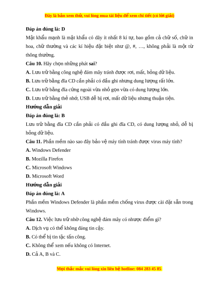 ề Windows Defender là ph n ầ m m ề ch ng ố virus đư c ợ cài đ t ặ s n ẵ trong Windows. Câu 12. Việc l u t ư rữ nh công ngh ờ ệ đám mây có như c ợ đi m ể gì? A. Dịch v có ụ th không đáng t ể in c y ậ . B. Có th b ể ị tin t c t ặ n công. ấ C. Không th xem ể n u không có I ế nternet. D. C ả A, B và C. M i