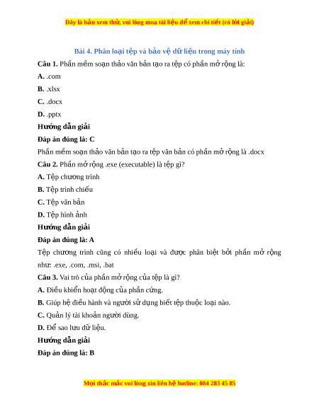 Đây là bản xem th , vu ử i lòng mua tài li u ệ đ xe ể m chi ti t (c ế ó l i ờ gi i ả ) Bài 4. Phân lo i ạ t p và b ệ o v ả ệ d l ữ i u t ệ rong máy tính Câu 1. Ph n m ầ m ề so n ạ th o văn b ả n ả t o r ạ a t p có ph ệ n m ầ r ở ng l ộ à: A. .com B. .xlsx C. .docx D. .pptx Hư ng d ớ ẫn gi i ả