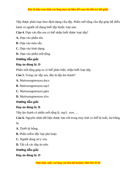 Đây là bản xem th , vu ử i lòng mua tài li u ệ đ xe ể m chi ti t (c ế ó l i ờ gi i ả ) Tệp đư c phân l ợ o i ạ theo đ nh d ị ng c ạ a ủ t p. Ph ệ n m ầ r ở ng c ộ a t ủ p gi ệ úp h đi ệ u ề hành và ngư i ờ sử d ng bi ụ t ế tệp thu c ộ lo i ạ nào. Câu 4. D a ự vào đâu em có th nh ể n ậ bi t ế đư c l ợ o i ạ t p? ệ A. D a ự vào ph n t ầ ên. B. D a vào m ự àu s c. ắ C. D a ự vào hình d ng. ạ D. D a ự vào ph n m ầ r ở ng. ộ Hư ng d ớ ẫn gi i ả Đáp án đúng là: D Ph n m ầ r ở ng gi ộ úp ta có th phân bi ể t ệ , nh n bi ậ t ế lo i ạ t p. ệ