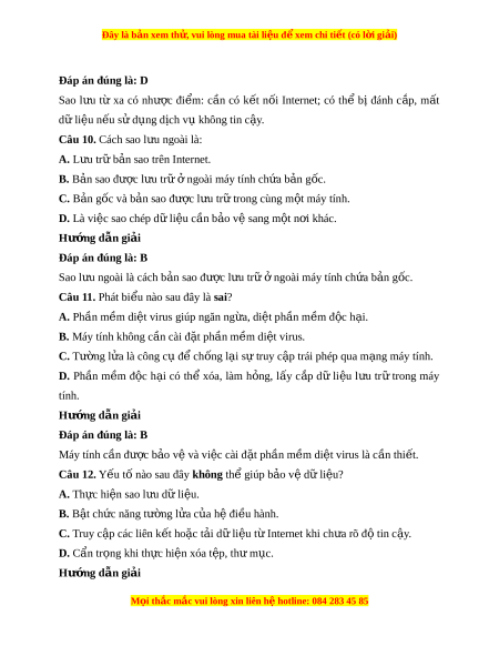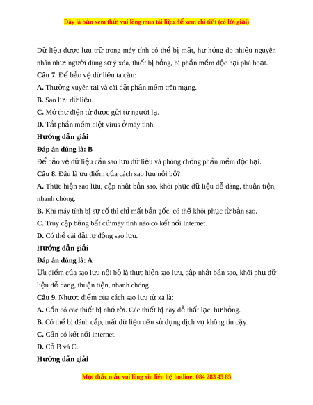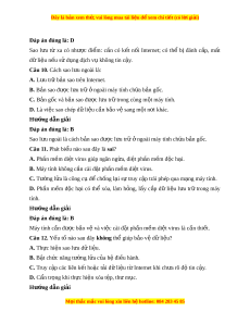 ư trữ trong máy tính có thể bị m t ấ , hư h ng ỏ do nhi u ề nguyên nhân nh : ư ngư i ờ dùng sơ ý xóa, thi t ế b h ị ng, ỏ b ph ị n m ầ m ề đ c ộ h i ạ phá ho t ạ . Câu 7. Để b o v ả ệ d l ữ iệu ta cần: A. Thư ng ờ xuyên t i ả và cài đ t ặ ph n m ầ m ề trên m ng. ạ B. Sao l u d ư l ữ i u. ệ C. M t ở h đi ư ện t đ ử ư c ợ g i ử t ng ừ ư i ờ l . ạ D. T t ắ phần m m ề di t ệ virus m ở áy tính. Hư ng d ớ ẫn gi i ả Đáp án đúng là: B Để b o v ả ệ d l ữ iệu cần sao l u d ư ữ li u và phòng ch ệ ống ph n m ầ m ề đ c h ộ i ạ . Câu 8. Đâu là u đi ư m ể c a cách ủ sao l u ư n i ộ b ? ộ A. Th c ự hi n ệ sao l u, ư c p ậ nh t ậ b n ả sao, khôi ph c ụ d ữ li u ệ d ễ dàng, thu n ậ ti n, ệ nhanh chóng. B. Khi máy tính b s ị c ự t ố hì ch m ỉ t ấ b n ả g c, ố có th khôi ể ph c t ụ b ừ n ả sao. C. Truy c p ậ b ng b ằ t ấ c m ứ áy tính nào có k t ế n i ố Internet. D. Có th cài ể đ t ặ tự đ ng s ộ ao l u. ư Hư ng d ớ ẫn gi i ả Đáp án đúng là: A Ưu đi m ể c a ủ sao l u ư n i ộ b l ộ à th c hi ự n s ệ ao l u, c ư p nh ậ t ậ b n s ả ao, khôi ph d ụ ữ li u d ệ dàng, t ễ hu n ậ ti n, nhanh ệ chóng. Câu 9. Như c ợ đi m ể c a cách ủ sao l u t ư xa l ừ à: A. Cần có các thi t ế b nh ị r ớ i ờ . Các thi t ế b này d ị ễ th t ấ l c, ạ h h ư ng. ỏ B. Có th b ể ị đánh c p, ắ m t ấ dữ li u n ệ u s ế d ử ng d ụ ch v ị không t ụ in c y ậ . C. Cần có k t ế nối internet. D. C B ả và C. Hư ng d ớ ẫn gi i ả M i