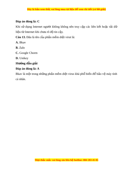 B. Máy tính không cần cài đ t ặ ph n m ầ m ề di t ệ virus. C. Tư ng ờ l a l ử à công cụ đ ch ể ống l i ạ sự truy c p ậ trái phép qua m ng m ạ áy tính. D. Ph n ầ m m ề đ c ộ h i ạ có thể xóa, làm h ng, ỏ l y ấ c p ắ d ữ li u ệ l u ư tr ữ trong máy tính. Hư ng d ớ ẫn gi i ả Đáp án đúng là: B Máy tính c n đ ầ ư c b ợ o ả v và vi ệ c cài ệ đ t ặ ph n m ầ m ề di t ệ virus là c n t ầ hi t ế . Câu 12. Y u t