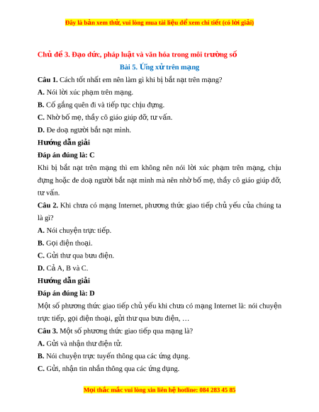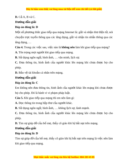 Đây là bản xem th , vu ử i lòng mua tài li u ệ đ xe ể m chi ti t (c ế ó l i ờ gi i ả ) D. C ả A, B và C. Hư ng d ớ ẫn gi i ả Đáp án đúng là: D M t ộ số phư ng ơ th c ứ giao ti p qua m ế ng I ạ nternet là: g i ử và nh n ậ thư điện t , nói ử chuyện tr c ự tuy n ế thông qua các ng ứ d ng, ụ g i ử và nh n ậ tin nh n ắ thông qua các ng d ứ ng, ụ …
