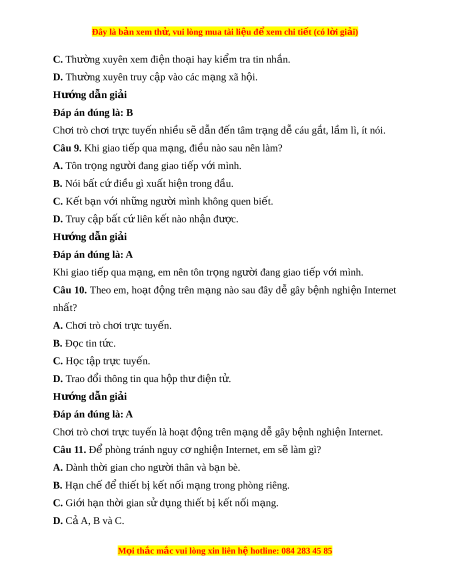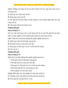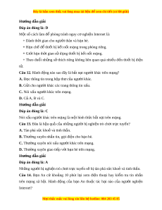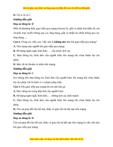Câu 9. Khi giao ti p qua ế m ng, đi ạ u nào s ề au nên làm? A. Tôn tr ng ng ọ ư i ờ đang giao ti p ế v i ớ mình. B. Nói b t ấ cứ đi u gì ề xu t ấ hi n t ệ rong đ u. ầ C. K t ế b n ạ v i ớ nh ng ng ữ ư i ờ mình không quen bi t ế . D. Truy c p b ậ ất c l ứ iên k t ế nào nh n ậ đư c. ợ Hư ng d ớ ẫn gi i ả Đáp án đúng là: A Khi giao ti p qua ế m ng, em ạ nên tôn tr ng ng ọ ư i ờ đang giao ti p ế v i ớ mình. Câu 10. Theo em, ho t ạ đ ng ộ trên m ng ạ nào sau đây d ễ gây b nh ệ nghi n ệ Internet nhất? A. Ch i ơ trò ch i ơ tr c ự tuy n. ế B. Đ c t ọ in t c. ứ C. H c ọ t p t ậ r c t ự uy n. ế