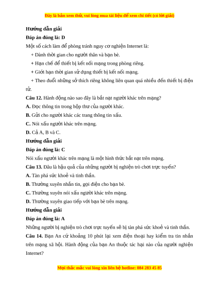 Câu 11. Để phòng tránh nguy cơ nghi n I ệ nternet, em s l ẽ àm gì? A. Dành th i ờ gian cho ngư i ờ thân và b n ạ bè. B. H n ch ạ ế đ t ể hi t ế b k ị t ế n i ố m ng ạ trong phòng riêng. C. Gi i ớ h n ạ th i ờ gian sử d ng t ụ hi t ế b k ị t ế n i ố m ng. ạ D. C ả A, B và C. M i