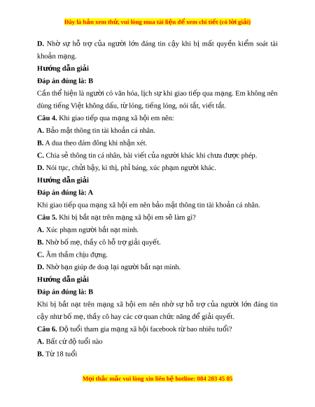 ẻ hông tin cá nhân, bài vi t ế c a ủ ngư i ờ khác khi ch a đ ư ư c ợ phép. D. Nói t c, ụ ch i ử b y ậ , kì th , ph ị báng, xúc ph ỉ m ạ ngư i ờ khác. Hư ng d ớ ẫn gi i ả Đáp án đúng là: A Khi giao ti p qua ế m ng xã h ạ i ộ em nên b o m ả t ậ thông tin tài kho n ả cá nhân. Câu 5. Khi b b ị t ắ n t ạ trên m ng xã h ạ i ộ em sẽ làm gì? A. Xúc ph m ạ ngư i ờ b t ắ n t ạ mình. B. Nh b ờ ố m , t ẹ h y cô h ầ ỗ tr gi ợ i ả quy t ế . C. Âm th m ầ ch u đ ị ng. ự D. Nhờ b n gi ạ úp đe doạ l i ạ ngư i ờ b t ắ n t ạ mình. Hư ng d ớ ẫn gi i ả Đáp án đúng là: B Khi bị b t ắ n t ạ trên m ng ạ xã h i