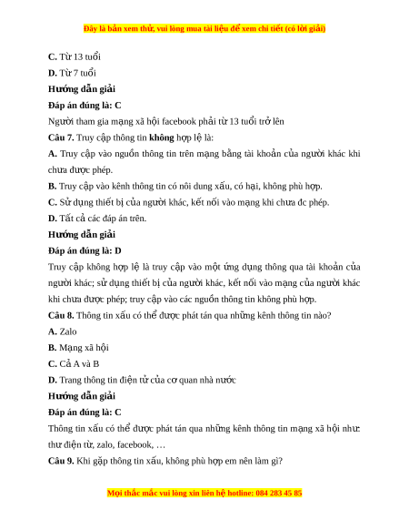 Đây là bản xem th , vu ử i lòng mua tài li u ệ đ xe ể m chi ti t (c ế ó l i ờ gi i ả ) C. T 13 t ừ uổi D. T 7 t ừ uổi Hư ng d ớ ẫn gi i ả Đáp án đúng là: C Ngư i ờ tham gia m ng xã h ạ i ộ facebook ph i ả t 13 t ừ u i ổ tr l ở ên Câu 7. Truy c p