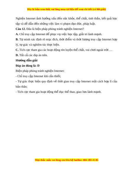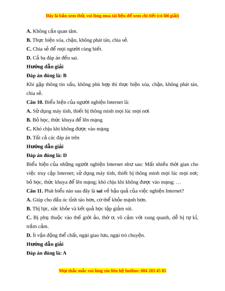 ặ không phát tán, chia s . ẻ C. Chia s đ ẻ m ể i ọ ngư i ờ cùng bi t ế . D. C ba đáp ả án đ u s ề ai. Hư ng d ớ ẫn gi i ả Đáp án đúng là: B Khi g p ặ thông tin x u, ấ không phù h p ợ thì th c ự hi n ệ xóa, ch n, ặ không phát tán, chia s . ẻ Câu 10. Bi u ể hi n c ệ a ng ủ ư i ờ nghi n I ệ nternet là: A. S d ử ng m ụ áy tính, thi t ế b t ị hông minh m i ọ lúc m i ọ n i ơ B. B h ỏ c, ọ th c khuya đ ứ l ể ên m ng ạ