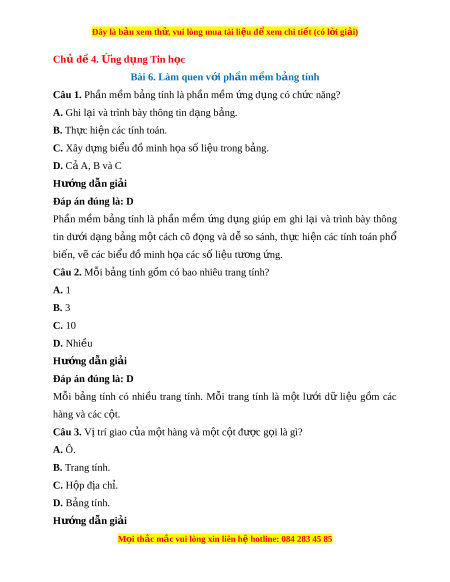 Đây là bản xem th , vu ử i lòng mua tài li u ệ đ xe ể m chi ti t (c ế ó l i ờ gi i ả ) Chủ đ 4. ề ng d Ứ ng ụ Tin h c ọ Bài 6. Làm quen v i ớ ph n m ầ m ề b ng t ả ính Câu 1. Ph n m ầ m ề b ng t ả ính là ph n m ầ m ề ng d ứ ng có ụ ch c năng? ứ A. Ghi l i