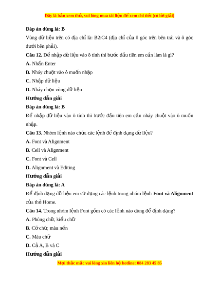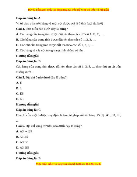 Đây là bản xem th , vu ử i lòng mua tài li u ệ đ xe ể m chi ti t (c ế ó l i ờ gi i ả ) Đáp án đúng là: A Vị trí giao c a m ủ t ộ hàng và m t ộ c t ộ đư c ợ g i ọ là ô tính (g i ọ t t ắ là ô)