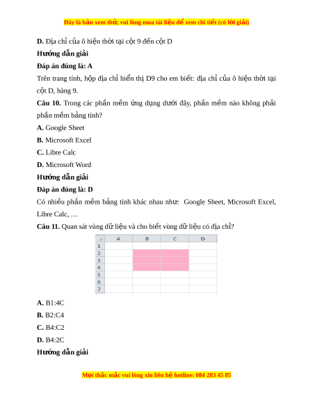 Đây là bản xem th , vu ử i lòng mua tài li u ệ đ xe ể m chi ti t (c ế ó l i ờ gi i ả ) D. Địa chỉ c a ủ ô hiện th i ờ t i ạ c t ộ 9 đ n c ế t ộ D Hư ng d ớ ẫn gi i ả Đáp án đúng là: A Trên trang tính, h p ộ đ a ị chỉ hi n ể thị D9 cho em bi t ế : địa chỉ c a ủ ô hi n ệ th i ờ t i ạ c t ộ D, hàng 9.