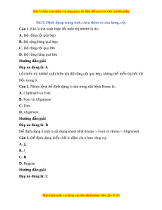 Câu 1. Khi ô tính xu t ấ hi n l ệ i ỗ hi n t ể h ##### l ị à do: A. Độ r ng c ộ t ộ quá hẹp B. Đ r ộ ng hàng quá h ộ ẹp C. Độ r ng c ộ t ộ quá l n ớ D. Độ r ng hàng ộ quá l n ớ Hư ng d ớ ẫn gi i ả Đáp án đúng là: A L i ỗ hi n t ể h ị##### xu t ấ hi n ệ khi đ ộ r ng c ộ t ộ quá h p, ẹ không th ể hi n ể th ịh t ế dữ li u t ệ rong ô. Câu 2. Nhóm l nh đ ệ đ ể nh d ị ng ô t ạ ính trong d i ả l nh H ệ ome là: A. Clipboard và Font B. Font và Alignment C. Font D. Alignmen Hư ng d ớ ẫn gi i ả Đáp án đúng là: B Để định d ng ạ ô tính ta s d ử ng ụ nhóm l nh H ệ