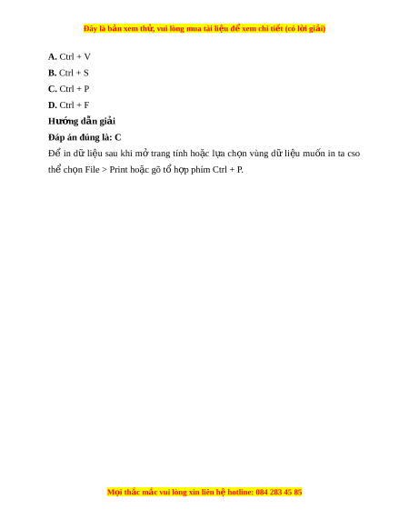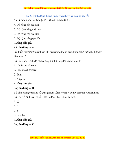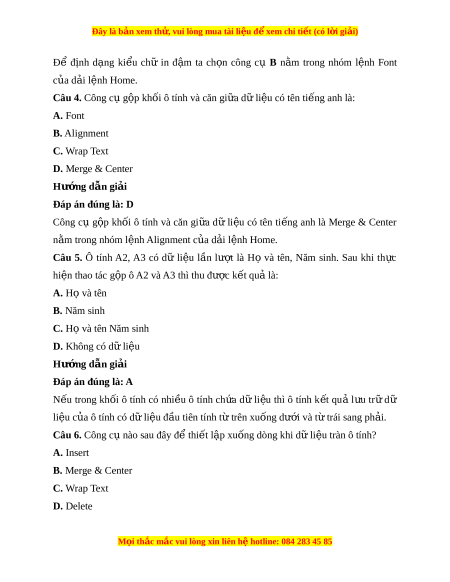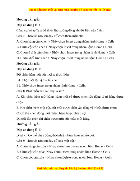Đây là bản xem th , vu ử i lòng mua tài li u ệ đ xe ể m chi ti t (c ế ó l i ờ gi i ả ) Hư ng d ớ ẫn gi i ả Đáp án đúng là: C Công c ụ Wrap Text đ t ể hi t ế l p ậ xu ng dòng khi ố d l ữ i u t ệ ràn ô tính