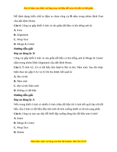 Đây là bản xem th , vu ử i lòng mua tài li u ệ đ xe ể m chi ti t (c ế ó l i ờ gi i ả ) Để định d ng ạ ki u ể chữ in đ m ậ ta ch n ọ công cụ B n m ằ trong nhóm l nh ệ Font c a ủ d i ả l nh H ệ ome. Câu 4. Công c g ụ p kh ộ ối ô tính và căn gi a d ữ ữ li u có t ệ ên ti ng ế anh là: A. Font B. Alignment C. Wrap Text D. Merge & Center Hư ng d ớ ẫn gi i ả Đáp án đúng là: D Công cụ g p ộ kh i ố ô tính và căn gi a ữ d ữ li u ệ có tên ti ng ế anh là Merge & Center n m ằ trong nhóm l nh ệ Alignment c a ủ d i ả l nh H ệ ome.