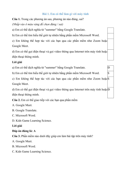 Câu 2. Em có thể giao tiếp với các bạn qua phần mềm A. Google Meet. B. Google Translate. C. Microsoft Word. D. Kids Game Learning Science. Lời giải Đáp án đúng là: A