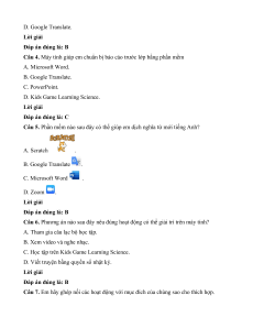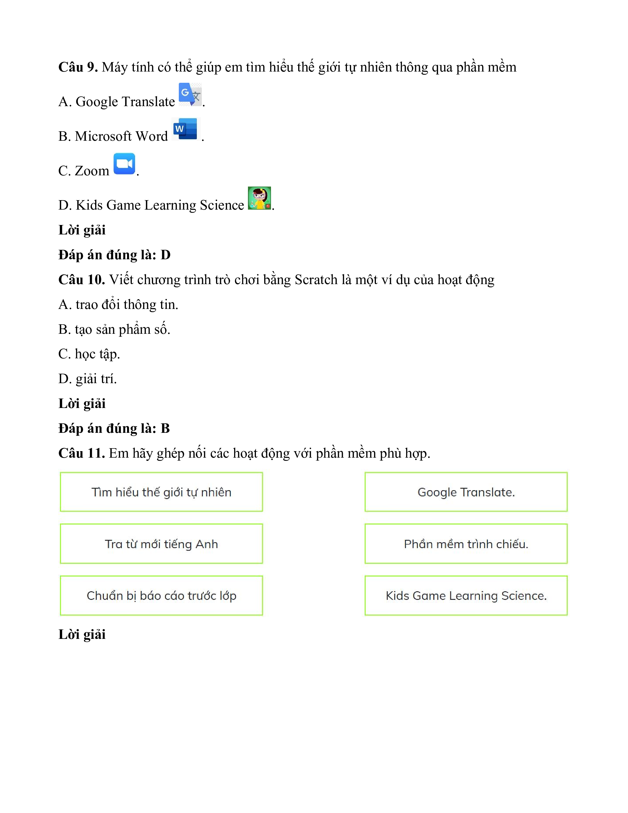 Câu 9. Máy tính có thể giúp em tìm hiểu thế giới tự nhiên thông qua phần mềm A. Google Translate . B. Microsoft Word . C. Zoom . D. Kids Game Learning Science . Lời giải Đáp án đúng là: D