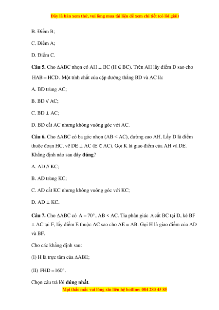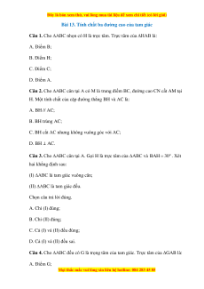 Câu 1. Cho ∆ABC nhọn có H là trực tâm. Trực tâm của ∆HAB là: A. Điểm B; B. Điểm H; C. Điểm C; D. Điểm A.