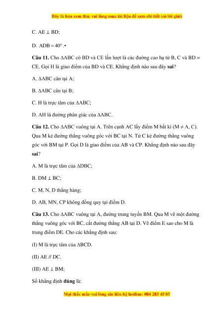 Câu 11. Cho ∆ABC có BD và CE lần lượt là các đường cao hạ từ B, C và BD =