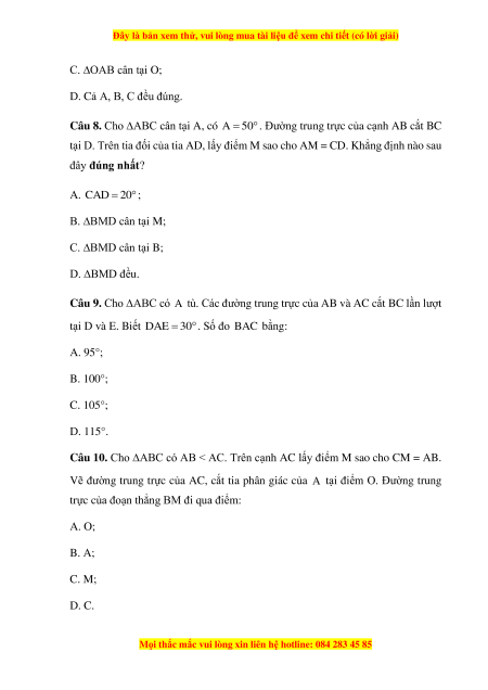 Câu 8. Cho ∆ABC cân tại A, có A = 50 . Đường trung trực của cạnh AB cắt BC