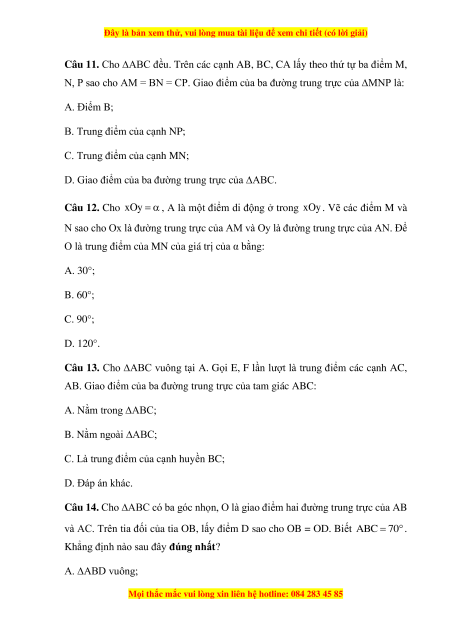 Câu 14. Cho ∆ABC có ba góc nhọn, O là giao điểm hai đường trung trực của AB