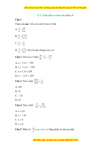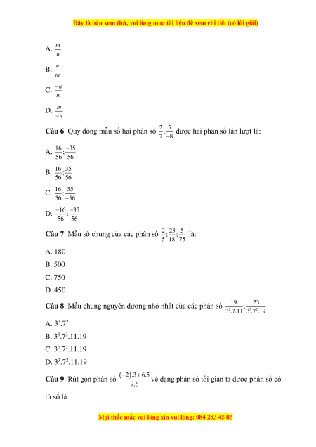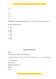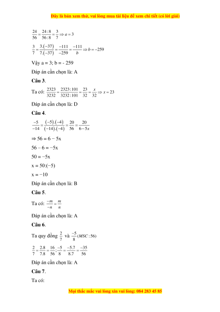 24 24 : 8 3 = = a = 3 56 56 : 8 7 3 3.( 3 − 7) 1 − 11 1 − 11 = ( − ) = = b = 259 − 7 7. 37 2 − 59 b Vậy a = 3; b = - 259 Đáp án cần chọn là: A Câu 3. 2323 2323 :101 23 x Ta có: = = = x = 23 3232 3232 :101 32 32 Đáp án cần chọn là: D Câu 4. 5 − ( 5 − ).( 4 − ) 20 20 = = = 1 − 4 ( 1 − 4).( 4 − ) 56 6 −5x ⇒ 56 = 6 − 5x 56 – 6 = −5x 50 = −5x x = 50:(−5) x = −10 Đáp án cần chọn là: B Câu 5. −m m Ta có: = −n n Đáp án cần chọn là: A Câu 6. Ta quy đồ 2 5 − ng và (MSC : 56) 7 8 2 2.8 16 5 − 5 − .7 3 − 5 = = ; = = 7 7.8 56 8 8.7 56 Đáp án cần chọn là: A Câu 7. Ta có: