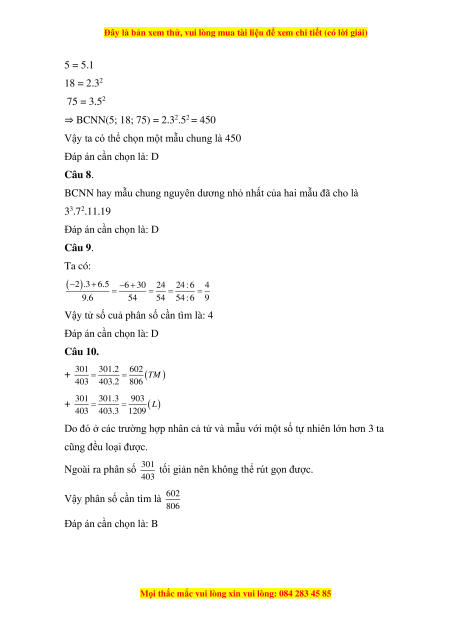 Câu 8. Mẫu chung nguyên dương nhỏ nhất của các phân số ; 2 3 2 3 .7.11 3 .7 .19 A. 33.72 B. 33.73.11.19 C. 32.72.11.19 D. 33.72.11.19 ( 2 − ).3+ 6.5
