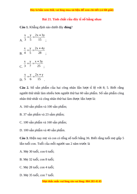 Đây là bản xem th , vu ử i lòng mua tài li u ệ đ xe ể m chi ti t ế (có l i ờ gi i ả ) Bài 21. Tính ch t ấ c a dãy t ủ s ỉ b ố ng nhau ằ Câu 1. Kh ng đ ẳ ịnh nào dư i ớ đây đúng? x y 2x 3y A. 3 5 15 ; x y 2x 4y B. 4 5 28 ; x y x 3y C. 3 7 25 ; x y 2x y D. 5 6 15 . Câu 2. Số s n ả ph m ẩ c a ủ hai công nhân l n ầ lư t ợ tỉ lệ v i ớ 8; 5. Bi t ế r ng ằ ngư i ờ th nh ứ t ấ làm nhi u h ề n ng ơ ư i ờ thứ hai 60 s n ả ph m ẩ . S s ố n ả ph m ẩ công nhân th nh ứ ất và công nhân th hai ứ làm đư c ợ l n l ầ ư t ợ là: A. 160 s n ả ph m ẩ và 100 s n ả ph m ẩ ; B. 37 s n ph ả ẩm và 23 s m ả ph m ẩ ; C. 100 s n ph ả ẩm và 160 s n ph ả m ẩ ; D. 100 s n ả ph m ẩ và 40 s n ả ph m ẩ . Câu 3. Hi n ệ nay mẹ và con có t ng ổ số tu i ổ b ng ằ 36. Bi t ế r ng ằ tu i ổ m ẹ g p ấ 5 lần tuổi con. Tuổi c a ủ mỗi ngư i ờ sau 2 năm trư c ớ là