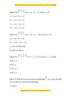 4 và 2x + 3y – 5z = –21. Giá tr x, y ị , z là A. x = 9, y = 6, z = 12; B. x = 6, y = 9, z = 12; C. x = 12, y = 9, z = 6; D. x = 12, y = 6, z = 9. a b c Câu 5. Cho 3 4