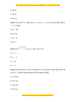 ỏ mãn 3x = 2y và y – x = 4. Giá tr ịc a ủ bi u ể th c ứ H = y2 – x2 b ng: ằ A. H = –80; B. H = 80; C. H = –4; D. H = 4. x y z Câu 9. Cho 2 3 5 và xyz = 240. Giá tr x l ị à A. x = 1,; B. x = –4; C. x = 4; D. x = 2. Câu 10. M t ộ tam giác có chu vi b ng