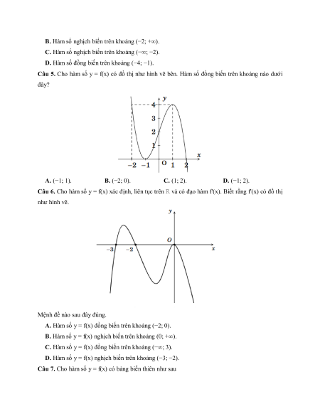 Câu 5. Cho hàm số y = f(x) có đồ thị như hình vẽ bên. Hàm số đồng biến trên khoảng nào dưới đây? A. (−1; 1). B. (−2; 0). C. (1; 2). D. (−1; 2).