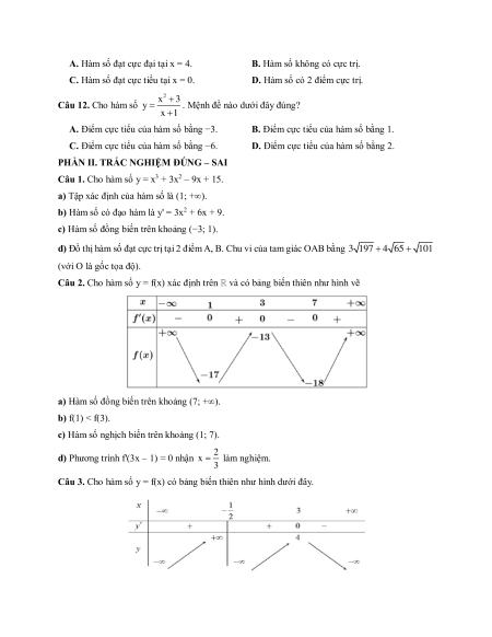 Trắc nghiệm Tính đơn điệu và cực trị của hàm số Toán 12 Đúng-Sai, Trả lời ngắn Kết nối tri thức form 2025