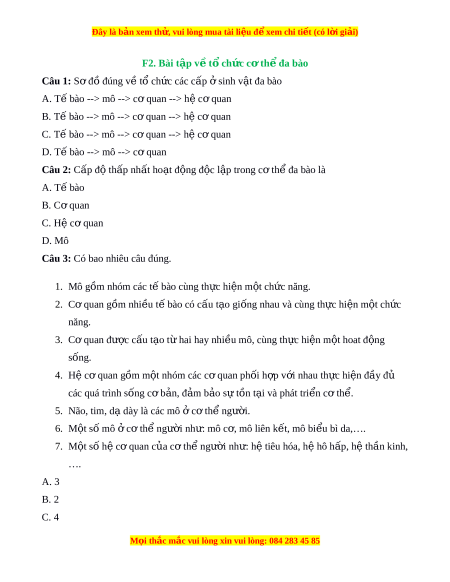 Đây là bản xem th , vu ử i lòng mua tài li u ệ đ xe ể m chi ti t (c ế ó l i ờ gi i ả ) F2. Bài tập v t ề ch ổ ức c t ơ h đa bào ể Câu 1: S đ ơ ồ đúng v t ề ổ ch c ứ các cấp s ở inh v t ậ đa bào A. T bào - ế