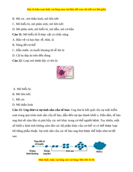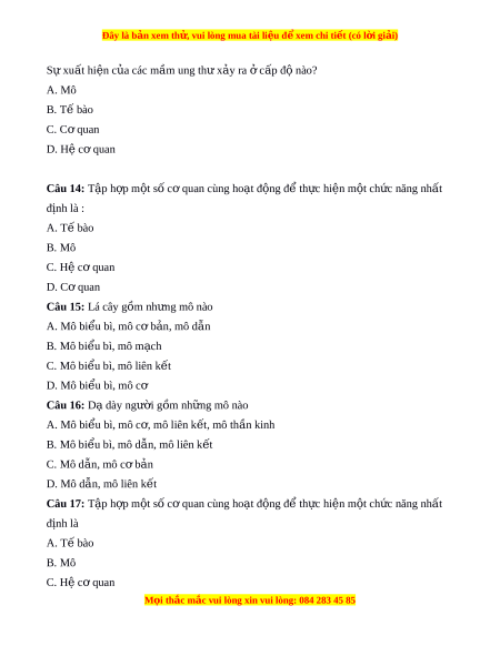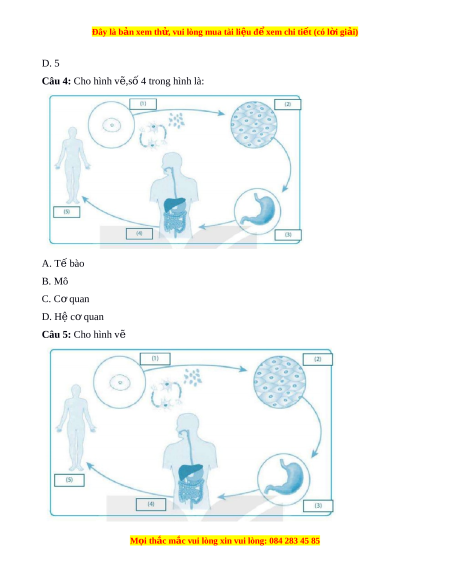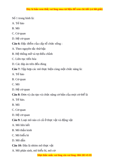 Đây là bản xem th , vu ử i lòng mua tài li u ệ đ xe ể m chi ti t (c ế ó l i ờ gi i ả ) Số 1 trong hình là: A. T bào ế B. Mô C. C quan ơ D. Hệ cơ quan Câu 6: Đ c ặ đi m ể c a c ủ p t ấ ổ ch c s ứ ống : A. Theo nguyên t c ắ th b ứ c ậ B. Hệ thống m và ở t đi ự u ch ề nh ỉ C. Liên t c ụ ti n ế hóa