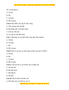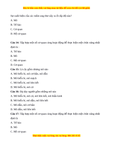 D. Các đáp án trên đ u đúng ề Câu 7: T p h ậ p các ợ mô th c ự hi n cùng ệ m t ộ ch c năng l ứ à: A. T bào ế B. C quan ơ C. Mô D. Hệ cơ quan Câu 8: Đ n v ơ ị câu t o ạ và ch c năng c ứ ơ b n c ả a ủ m i ọ c t ơ h l ể à A. T bào. ế B. Mô C. C quan ơ D. Hệ cơ quan Câu 9: Lo i ạ mô nào có cả t ở h c v ự t ậ và đ ng v ộ t ậ A. Mô liên k t ế B. Mô thần kinh C. Mô bi u bì ể D. Mô dẫn