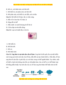 D. Mô phân sinh, mô bi u bì ể , mô d n, m ẫ ô c b ơ n ả Câu 11: Mô bi u b ể ỉ t ở h c v ự t ậ có ch c năng ứ A. B o v ả ệ và bao b c ọ r , t ễ hân, lá B. Nâng đ c ỡ ơ thể C. Dẫn nư c và m ớ uối khoáng t r ừ l ễ ên lá D. C ba đáp ả án trên đ u ề đúng Câu 12: Lo i ạ mô dư i ớ đây có tên là: A. Mô bi u bì ể . B. Mô liên k t ế . C. Mô c . ơ D. Mô th n ki ầ nh Câu 13: Ung th và s ư s ự inh s n c ả a t ủ bào ế : Ung th l ư à k t ế qu c ả a ủ s m ự t ấ ki m ể