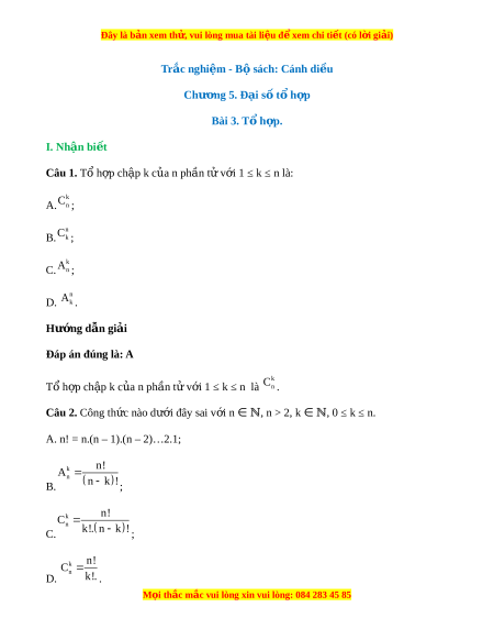 ệ - Bộ sách: Cánh di u ề Chư ng ơ 5. Đ i ạ s t ố h ổ p ợ Bài 3. T h ổ p. ợ I. Nhận bi t ế Câu 1. Tổ h p ch ợ p ậ k c a n ph ủ ần t v ử i ớ 1 ≤ k ≤ n là: k A.Cn ; n B.Ck ; k C. An ; n D. Ak . Hư ng d ớ ẫn gi i ả Đáp án đúng là: A k T h ổ p ợ ch p k c ậ a ủ n ph n t ầ v ử i