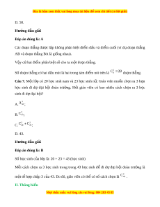 Đây là bản xem th , vu ử i lòng mua tài li u ệ đ xe ể m chi ti t (c ế ó l i ờ gi i ả ) D. 58. Hư ng d ớ ẫn gi i ả Đáp án đúng là: A Các đo n ạ th ng ẳ đư c ợ l p ậ không phân bi t ệ đi m ể đ u ầ và đi m ể cu i ố (ví d ụ đo n ạ th ng ẳ AB và đo n t ạ h ng ẳ BA là gi ng nhau) ố . V y ậ c hai ứ đi m ể phân bi t ệ s cho ẽ ta m t ộ đo n t ạ h ng. ẳ 2 Số đo n t ạ h ng ẳ có hai đ u m ầ út là hai trong tám đi m ể nói trên là C 28 8 đo n t ạ h ng. ẳ Câu 7. M t ộ l p ớ có 20 h c ọ sinh nam và 23 h c ọ sinh n . ữ Giáo viên mu n ố ch n ọ ra 3 b n ạ h c ọ sinh đi dự đ i ạ h i ộ đoàn trư ng. ờ H i
