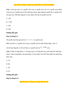 Đây là bản xem th , vu ử i lòng mua tài li u ệ đ xe ể m chi ti t (c ế ó l i ờ gi i ả ) D. 20. Hư ng d ớ ẫn gi i ả Đáp án đúng là: B Mỗi t p ậ con có 3 ph n t ầ c ử a t ủ p ậ A là m t ộ t h ổ p ợ ch p 3 c ậ a ủ 5. 3 Do đó, có số t p con l ậ à: C 1 0 5 t p con. ậ Câu 5. M t ộ h p có 5 bi ộ