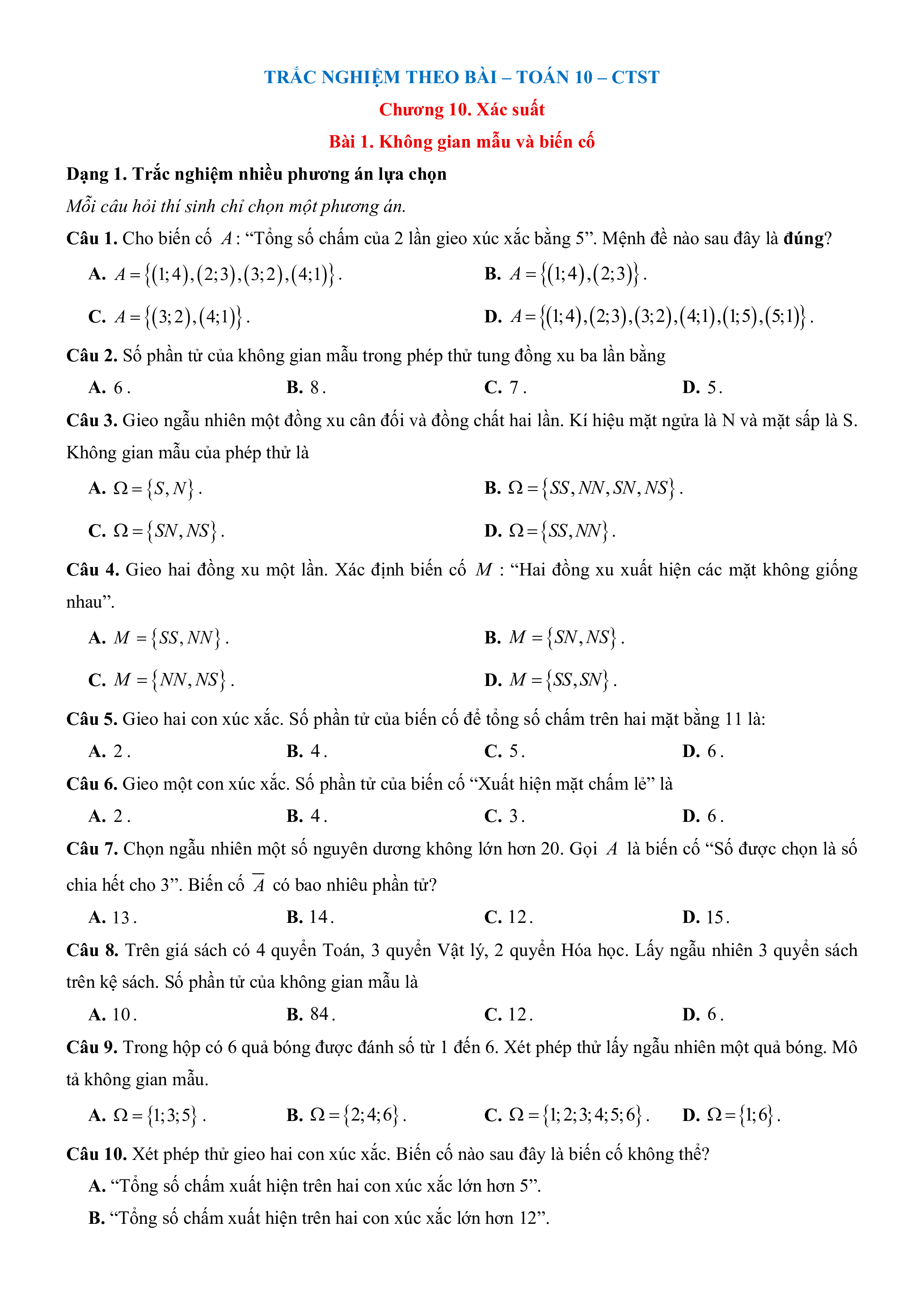 TRẮC NGHIỆM THEO BÀI – TOÁN 10 – CTST