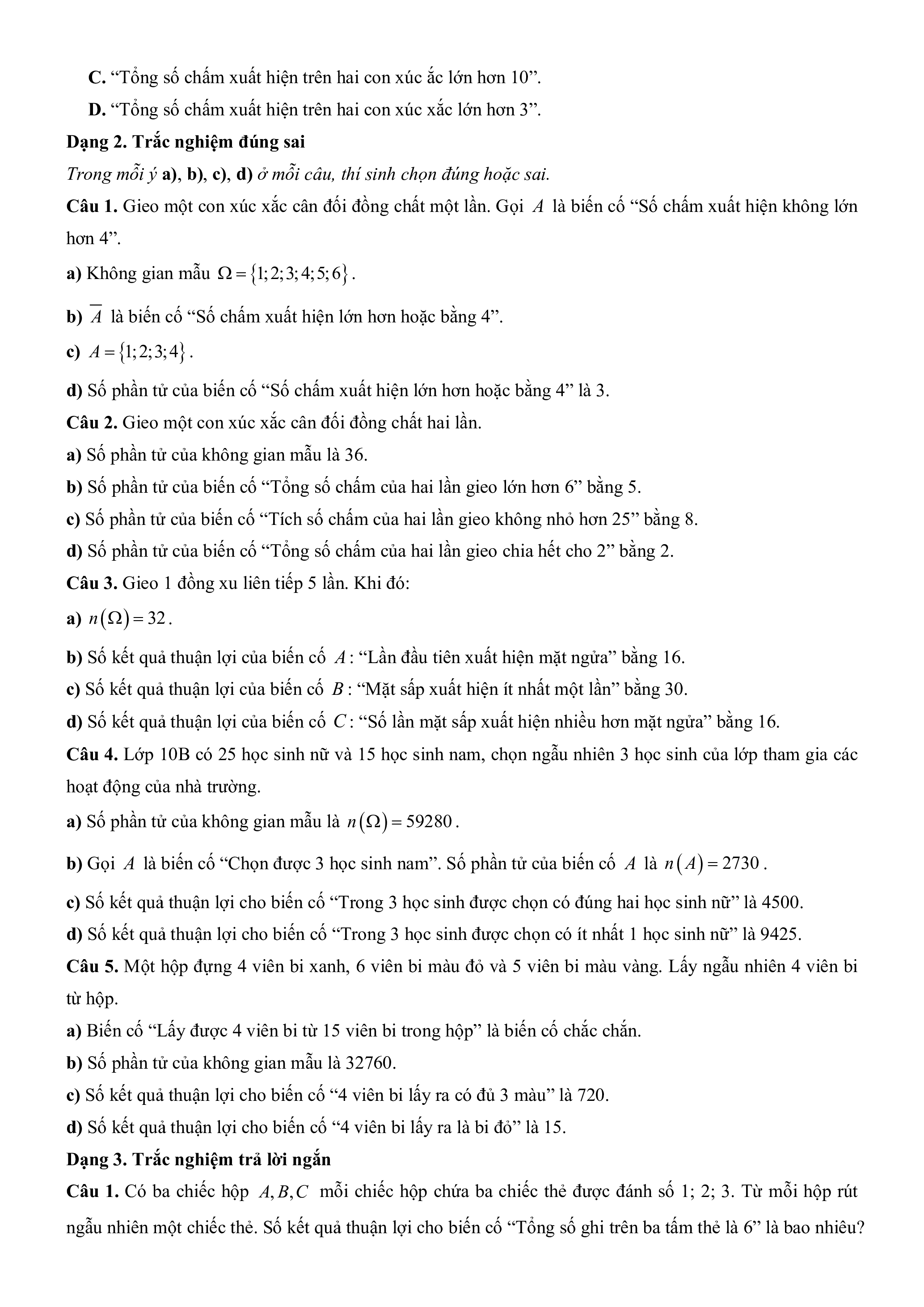 Câu 1. Gieo một con xúc xắc cân đối đồng chất một lần. Gọi A là biến cố “Số chấm xuất hiện không lớn hơn 4”.