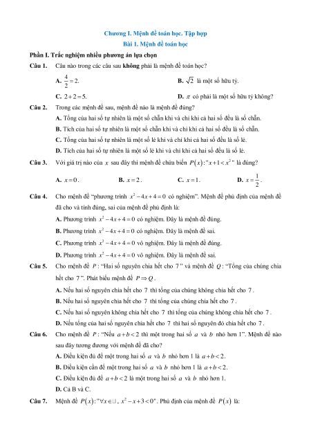 Câu 1. Câu nào trong các câu sau không phải là mệnh đề toán học? 4 A. 2.