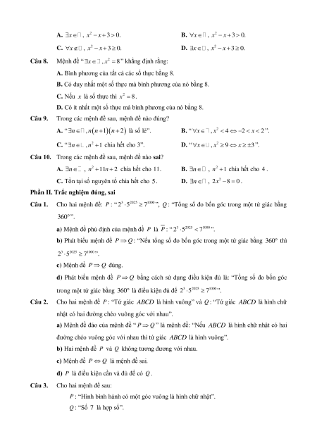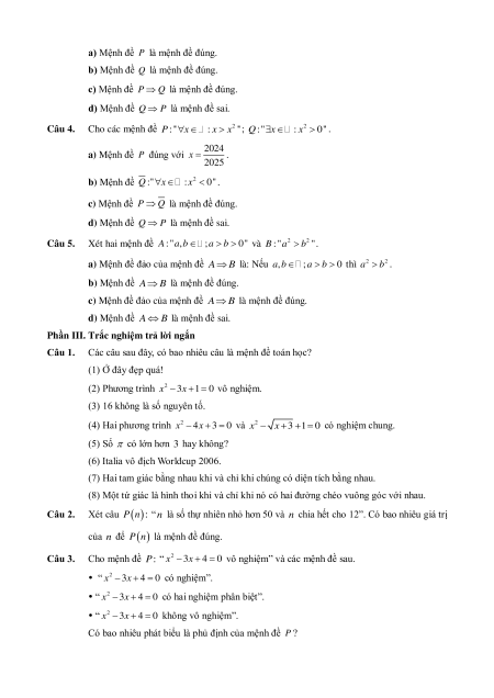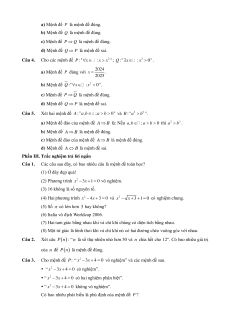 d) Mệnh đề Q P là mệnh đề sai. Câu 4. Cho các mệnh đề 2 P : ' x