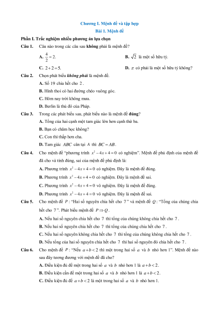 Chương I. Mệnh đề và tập hợp Bài 1. Mệnh đề
