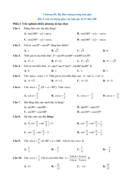 Câu 4. Giá trị của biểu thức A tan1tan 2tan 3 . ..tan88tan89 là A. 0 . B. 2 . C. 3 . D. 1. Câu 5.