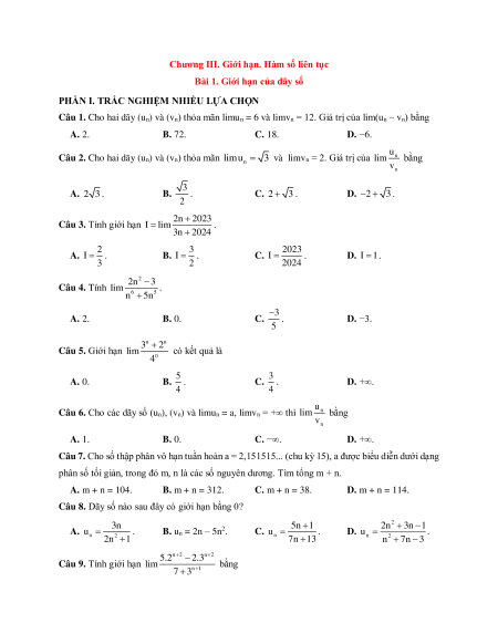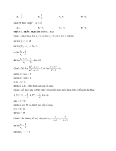 Câu 1. Cho hai dãy (un) và (vn) thỏa mãn limun = 6 và limvn = 12. Giá trị của lim(un – vn) bằng A. 2. B. 72. C. 18. D. −6. u Câu 2. Cho hai dãy (u n) và (vn) thỏa mãn lim u 3 và limv lim bằng n n = 2. Giá trị của n vn 3 A. 2 3 . B. . C. 2 3 . D. 2 3 . 2