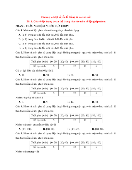 Câu 5. Khảo sát thời gian sử dụng điện thoại di động trong một ngày của một số học sinh khối 11