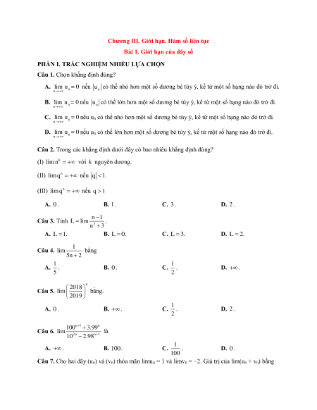 lim q nếu q 1 A. 0 . B. 1. C. 3 . D. 2 . Câu 3. Tính n 1 L lim . 3 n 3 A. L 1. B. L 0. C. L 3. D. L 2. Câu 4. 1 lim bằng 5n 2 A. 1 . B. 0 . C. 1 . D. . 5 2 n Câu 5. 2018 lim bằng. 2019 A. 0 . B. . C. 1 . D. 2 . 2 n 1 n Câu 6. 100 3.99 lim là 2n n 1 10 2.98 A. . B. 100. C. 1 . D. 0 . 100