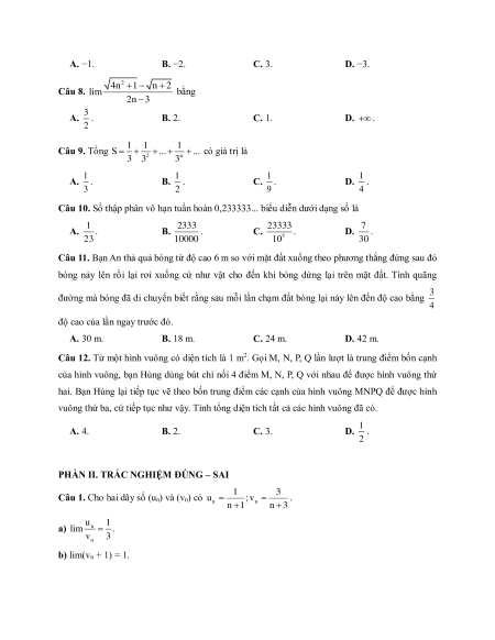 Câu 7. Cho hai dãy (un) và (vn) thỏa mãn limun = 1 và limvn = −2. Giá trị của lim(un + vn) bằng A. −1. B. −2. C. 3. D. −3. 2 Câu 8. 4n 1 n 2 lim bằng 2n 3 A. 3 . B. 2. C. 1. D. . 2 Câu 9. Tổng 1 1 1 S ... ... có giá trị là 2 n 3 3 3 A. 1 . B. 1 . C. 1 . D. 1 . 3 2 9 4