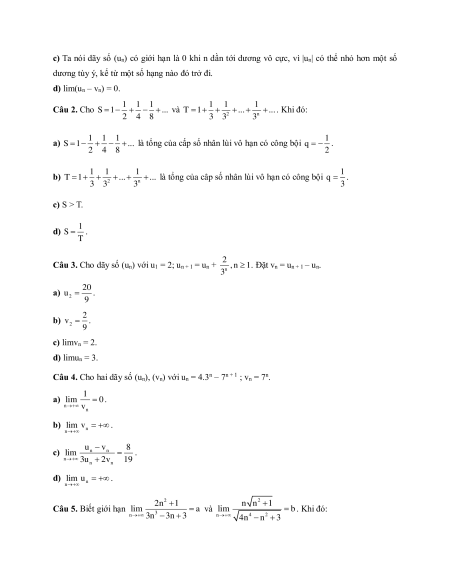 dương tùy ý, kể từ một số hạng nào đó trở đi. d) lim(un – vn) = 0. Câu 2. Cho 1 1 1 1 1 1 S 1