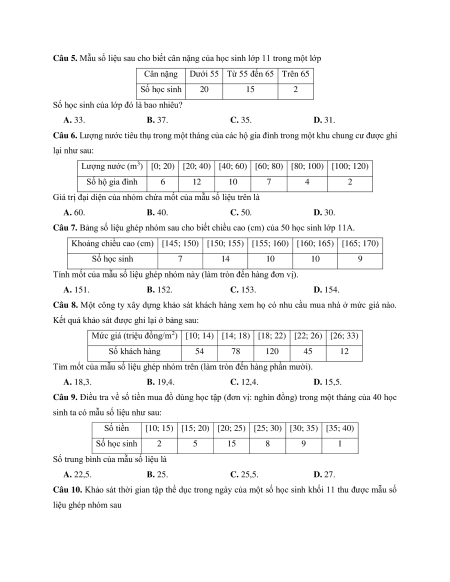 Câu 5. Mẫu số liệu sau cho biết cân nặng của học sinh lớp 11 trong một lớp