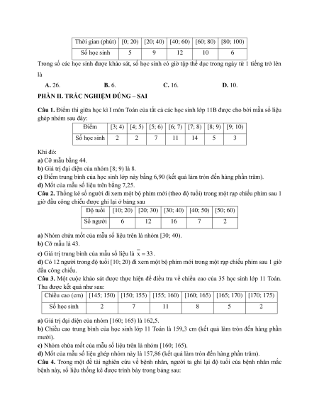 Câu 1. Điểm thi giữa học kì I môn Toán của tất cả các học sinh lớp 11B được cho bởi mẫu số liệu ghép nhóm sau đây: Điểm